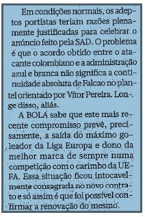 contudo, e no seguimento da ideia explanada no post de ontem - a de que a renovação do contrato de Falcao com o FC Porto incomodou muito "boa" gente - o editorial do pasquim da Travessa da Queimada, cujo título "sobre Falcao e ainda mais", assinado por josé manuel delgado, não engana quanto ao espinho atravessado na garganta e ao eucalipto (igualmente atravessado) que, de repente, sentiu causar incómodo numa outra parte do seu corpo. atente-se no fel das seguintes palavras: