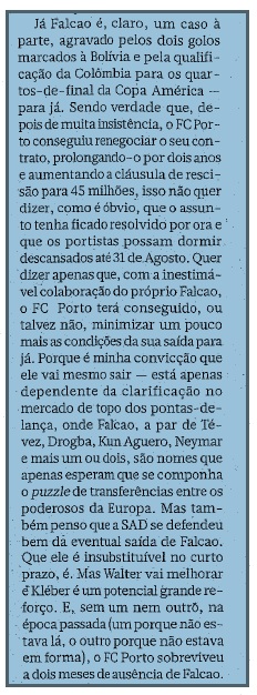 pelo meio, também te podes deliciar com as pseudo-notícias que dão como «quase certas» (porque «eminentes») as transferências de João Moutinho («na mira do Chelsky») e de Radamel Falcao («colombiano dificilmente voltará a jogar no Dragão»).