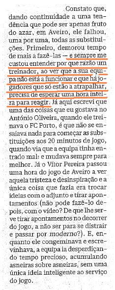 o mesmo já não se pode dizer da visão torpe de Cruz dos Santos, no seu (abjecto) artigo de intoxicação "'penalties' e expulsões", ao (in)tentar fazer passar a mensagem de que houve uma grande penalidade por assinalar em Aveiro. para além da opinião unânime no painel relativo às questões de arbitragem no jornal diário desportivo OJOGO, refiro este facto: o sr. Valdemar Duarte após ter clamado por «penalty!» no imediato do lance, mudou de opinião e sustentou que se tratava de uma «clara simulação» após o visionamento das dez (!!) repetições daquele lance.