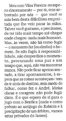 penso que ainda vai a tempo a divulgação da NORTADA publicada na edição de hoje do pasquim da Travessa da Queimada. sob o título de "afinal, já não sei...", Miguel Sousa Tavares faz jus às minhas críticas sobre a bipolaridade e os histerismos de alguns portistas após o empate do passado Domingo e «apenas e só» decorridas que estão cinco jornadas do campeonato.