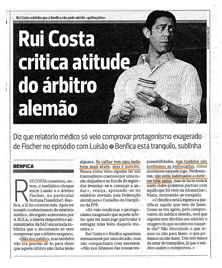 da edição impressa do pasquim da Travessa da Queimada, da passada Sexta-feira e cuja divulgação à saciedade se encontrava em falta, o que realmente me chamou a atenção e fez-me esboçar um sorriso cínico, foram as seguintes declarações do "Ruizinho dos Túneis" (aquele que lança ataques de índole pessoal, nos bastidores, na presença de delegados da Liga e permanece impune, desde Março de 2012):