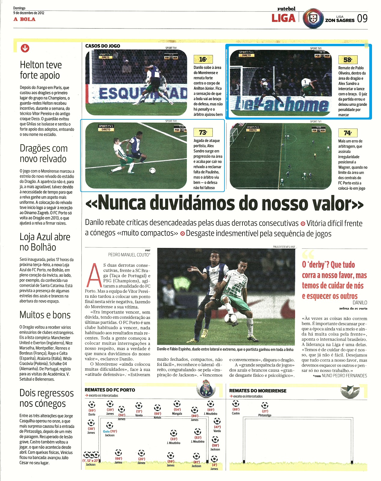 sobre o nosso quotidiano, e para lá do singelo dossier de oito páginas dedicado ao rescaldo da vitória ante o Moreirense - e com especial relevância para os casos de arbitragem destacados pelo pasquim em causa -, da crónica (num tom muito triste) "um míssil a Ferraz e fogo" (da autoria de hugo costa e dedicada à esfuziante vitória ante o 5lb em andebol), e dos paupérrimos dossiers de três páginas de 10 de Dezembro (sem nada de destaque) e de 11 de Dezembro (com a notícia do provável regresso das trivelas ciganas ao Estádio do Dragão), há a destacar as declarações de André £ibras-Boas em defesa de Helton (mas publicada no jornal diário desportivo OJOGO, e a 06 de Dezembro).