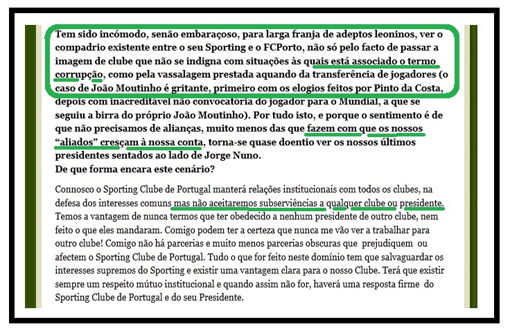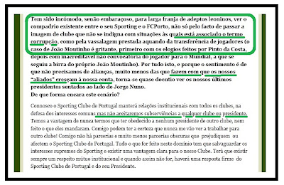 no meu entendimento, aquela estratégia comunicacional do FC Porto não se deveria "limitar" (quase que em regime de exclusividade) às presidenciais intervenções de Jorge Nuno de Lima Pinto da Costa; antes deveria considerar o resguardo deste último, e mesmo que a mesma tivesse o seu crivo e/ou cunho pessoal - para além de que sou só mais um adepto que considera que o "Porto Canal" deveria assumir outra postura na defesa intransigente dos interesses do Futebol Clube do Porto, mas sempre assumindo uma atitude diferenciadora (porque de cariz positivo) de outros canais de clubes portugueses.