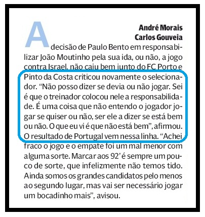 considero a recente polémica de carácter nacional, a envolver o nosso grande presidente com o actual seleccionador nacional, sintomática do desagrado que manifestei anteriormente.