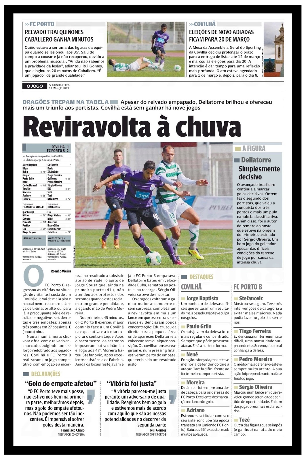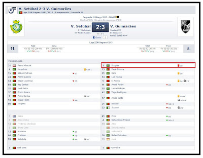 O lance da expulsão é inacreditável! O Douglas nem lhe toca, o gajo cava a falta, o Olegário está a ver e marca!!! Para compôr o ramalhete, o filho de uma senhora que não passa recibo dá vermelho num lance onde ele desvia a bola para a linha de fundo e nunca mais na vida a ia buscar!