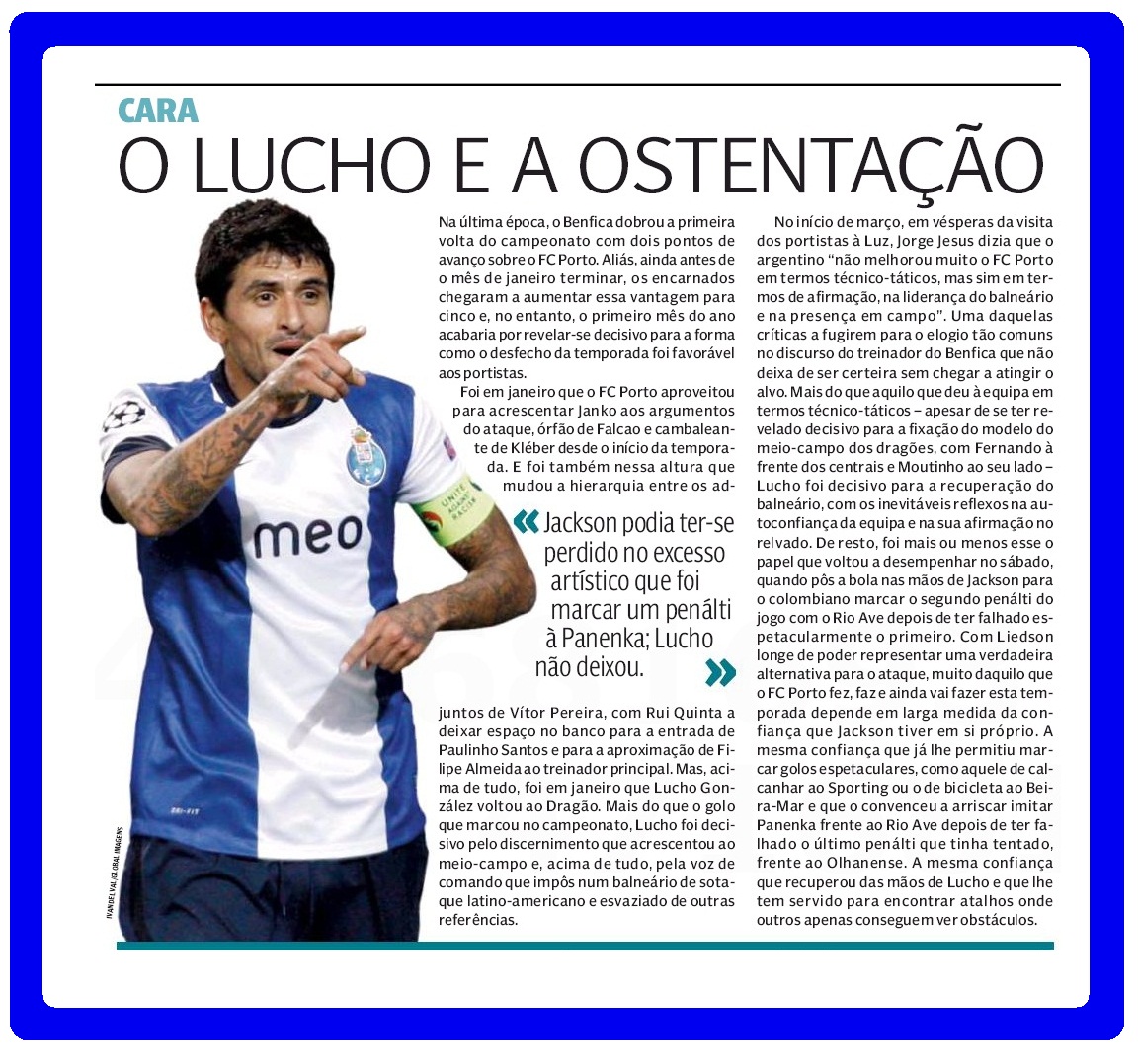 para lá do abjecto (porque provocador) editorial "não há clássicos A, nem clássicos B" (da autoria de fernando guerra); da peça jornalística de miguel cardoso pereira "a maldição de Panenka" e dos artigos de opinião "o regresso dos heróis" (de luís freitas lobo), e "Alice de verde-e-branco II" (de Paulo Teixeira Pinto); do dossier dedicado ao FC Porto (com relevância para a peça que se refere (nada inocentemente) ao «calor da noite», e para a estreia de Paulo Futre nestas andanças, mas sendo o especial destaque para a sua segunda parte, pelo que (não) é referido a propósito da suspensão de Edo Bosh); das declarações de frederico varandas sobre as lesões de Izmaylov; da notícia sobre o «Messi-Ronaldo» que também é Drogba, talvez recomende a leitura atenta das declarações do Dumbo de Carnide a propósito de empréstimos (pela instantânea analogia que fiz, mas em relação a um «glorioso» passado muito recente e que está bem vincado na memória de todos os portistas).