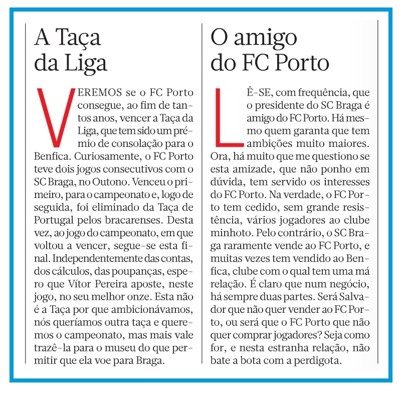 ainda sobre o nosso quotidiano e de acordo com o dossier dedicado ao FC Porto pela redacção do pasquim da Travessa da Queimada, na edição impressa de hoje, ficamos a saber que o encontro de amanhã, ante os "gverreiros do Minho", para a tal final desse magnífico troféu que é a "ex-taça da bjeKa"® aka taça lucílio baptista aka "coiso das 72 horas"®), é considerado pela Liga Portuguesa de Futebol (muito pouco) Profissional de «alto risco».