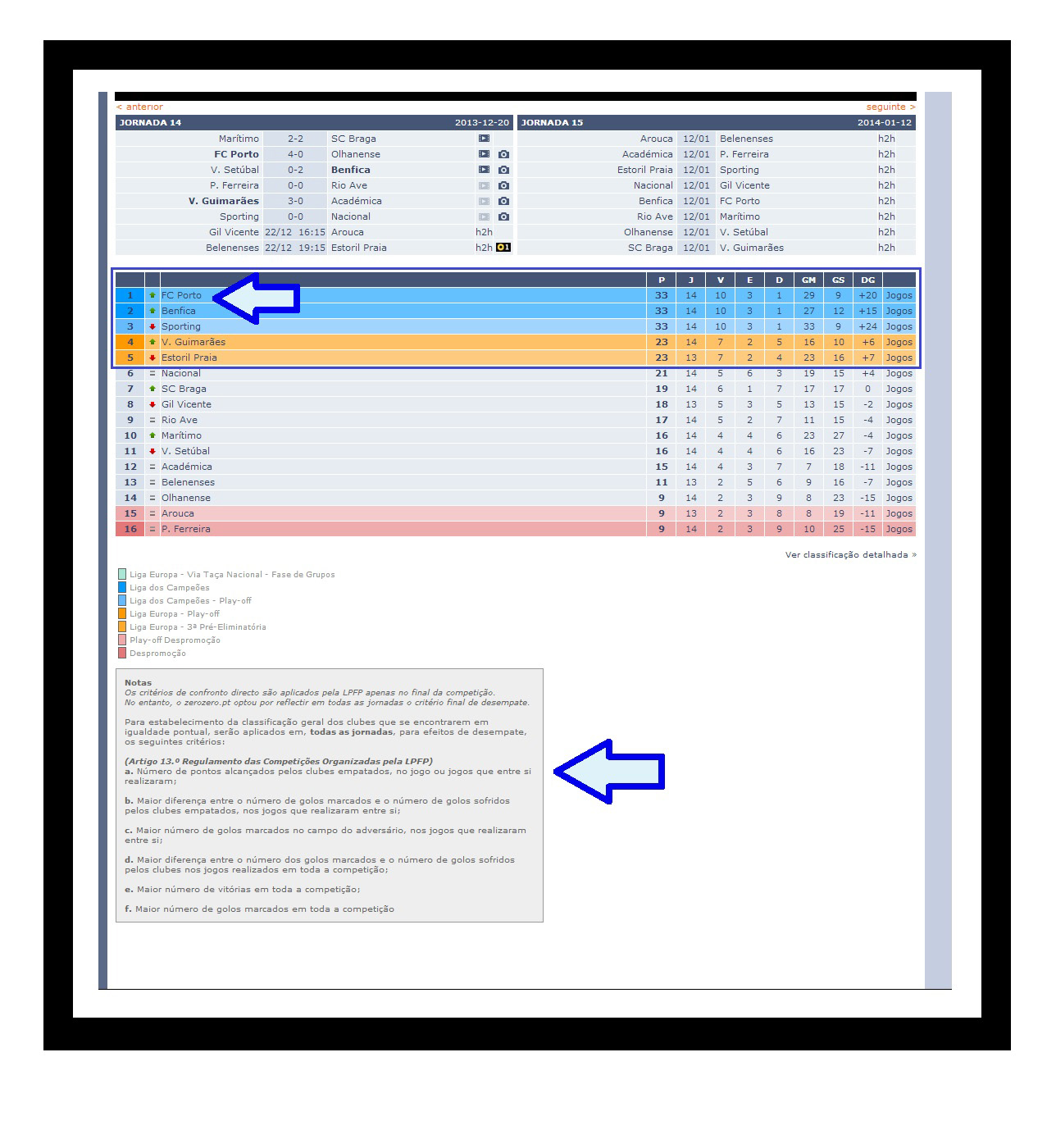 Miguel, para estabelecer a classificação em cada jornada, o ponto 3 do artigo 13º, diz que é a diferença de golos é o 1º critério. Para apurar a classificação final da competição é que se aplica o ponto 1. Mas o que interessa é estar em primeiro lugar na 30ª jornada, tal como aconteceu o ano passado e no anterior e ainda no anterior.