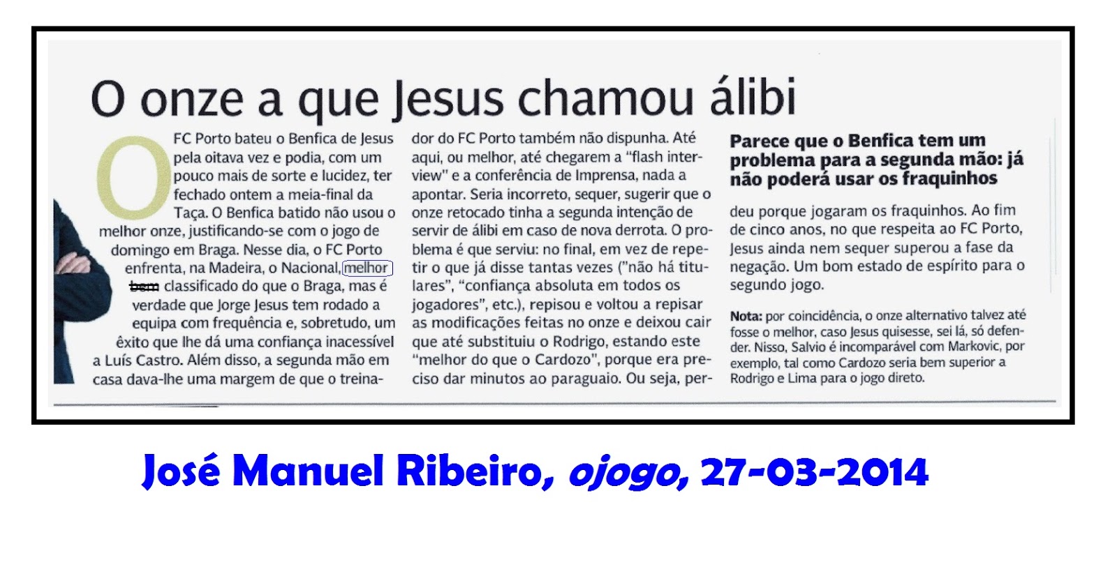 afirmo-o porque, desde o encontro ocorrido no "coiso" que dizem que se assemelha a um estádio (mas que, com aquela quantidade absurda de azulejos, alguns deles de cores duvidosas, mais parece uns lavabos que nunca foram limpos desde a sua inauguração), perdido lá para o "reino distante dos viscondes falidos de Alvaláxia"®, e principalmente desde Domingo passado, depois da partida frente ao clube de Belém, que a esmagadora maioria da abjecta, muito parcial e demasiado facciosa Comunicação Social nacional, e sempre com o beneplácito da estação (cada vez menos) pública de televisão - agora sem o prestimoso contributo de hélder conduto...) -, nos dava como "mortos". como a seguir veremos, trata-se da mesma Comunicação Social que (quase que) garantia que a eliminatória desta noite seriam "favas contadas" para a agremiação de Carnide. e só não afirmaram que seria "um passeio" por mero acaso e/ou coincidência, mas andaram lá perto...