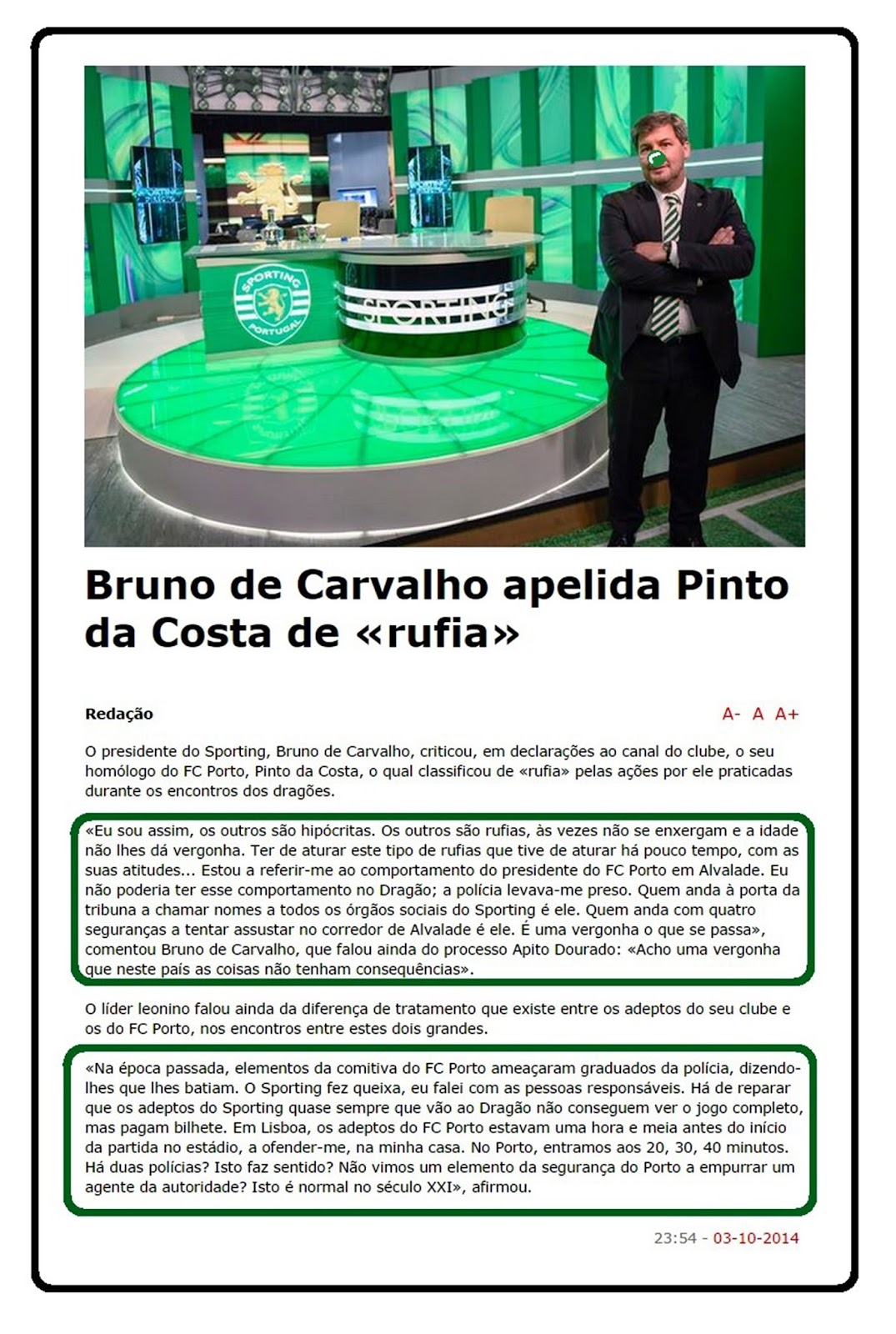 aquelas aspas são bastante pertinentes, pois que referem-se ao que o «clubisticamente imparcial» santos neves afirmou na passada Quinta-feira... é só mais um a (in)tentar "tapar o Sol com uma peneira", pois que as evidências são demasiadas para serem sonegadas e por mais capas manhosas que se inventem...