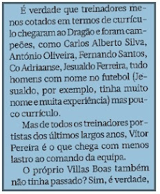 mas, não foi só este cromo a dedicar uma prosa sobre o nosso treinador. o mauzinho do João, na sua coluna FORA DE JOGO, também resolveu implicar com Vítor Pereira e fazer uma redacção nos mesmos termos, sob o título "palmadinhas nas costas". eis, para mim, a melhor parte do seu escrito: