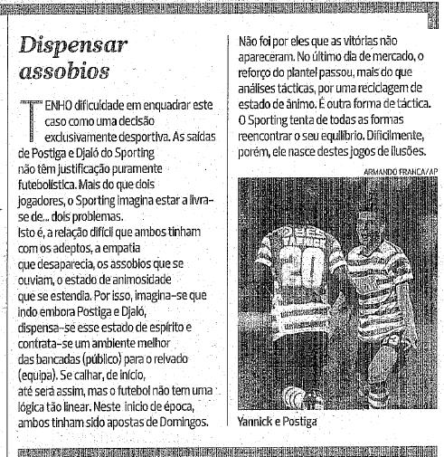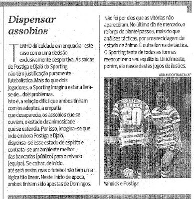 já o artigo de Luís Freitas Lobo "o jogador e os seus 'sócios tácticos'" revela um indisfarçável mal-estar pela liderança do campeonato porventura não estar com o seu clube do seu coração. e este não é (de todo!) o FC Porto. se dúvidas houver, atente-se na ironia da referência ao «avião a jacto» e por mais do que uma vez. também não deixa de ser interessante a seguinte perspectiva sobre a recente venda de duas "unhas" (encravadas) do clube dos vasquinhos: