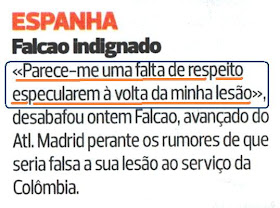 3) Radamel Falcao começa a perceber melhor (e no duro) algumas das diferenças entre os dois países da Península Ibérica - por exemplo, a do tratamento jornalístico - como se demonstra: