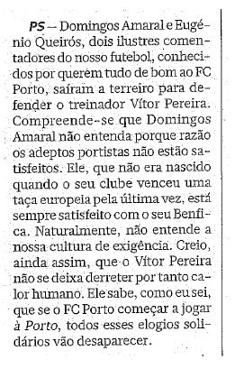 ainda sobre o quotidiano azul-e-branco, aconselho a leitura das declarações de Vítor Pereira, no lançamento da partida de amanhã, ante a briosa Académica. sincera e honestamente, não gostei de perceber que o treinador principal do meu clube do coração não consegue «ser preciso ao ponto de dizer se a paragem [para os compromissos com a Selecção] foi benéfica ou não». com certeza que o "defeito" estará em mim, que já embirro por tudo e por nada.