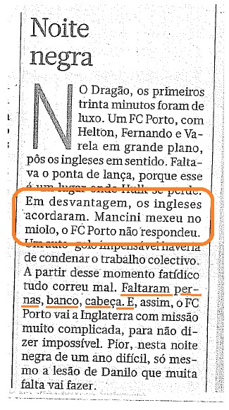 (c) fui «pouco humilde» para com a atitude da equipa no final do encontro, apesar de não o ter escrito na crónica em causa - «apenas e só» pensei-o para com os meus botões.