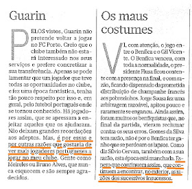 2) da notícia "última chamada para Rolando e Varela", da autoria de nuno vieira;3) da nova vida de Aloísio (e para minha surpresa) num clube 'fiuza';4) das (estapafúrdias, ridículas e tratantes) explicações de carlos cardoso, actual presidente da Confederação do Desporto de Portugal, a propósito de, na época transacta, André £ibras-Boas e Futebol Clube do Porto não terem sido agraciados com o "Prémio Prestígio" daquela instituição;5) a (abjecta porque nojenta) notícia do sr. carlos-com-apelido-de-substantivo-colectivo-para-o-que-ele-é, onde subsiste uma indisfarçável azia lampiónica;6) a constatação de que há "gigantes de olho no Dragão", por parte de nuno vieira (certamente que, por andar demasiado entretido com factos da agremiação de Carnide, desconhece que aqueles já andam "de olho" no nosso clube há mais de vinte anos;7) o elogio público de Vítor Baía a Helton pelo seu «trabalho extraordinário»;8) a recordação da conquista da Champions, em 2004, pelo nosso mágico Deco;9) a crónica à última partida de hóquei - "o 11 como obsessão" -, da autoria de bruno leite (mais um que sofre quando não tem kompensan® em casa);10) o artigo do quadragésimo aniversário de um dos melhores jogadores que já vi "ao vivo e a cores": Rivaldo, de seu nome;11) a referência aos dois artigos de opinião, publicados na revista "DRAGÕES" de Abril, e sobre os quais haverá novidades em breve.