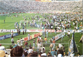 como vi esse jogo na Superior Norte, local onde se concentravam os (já na altura ilegais) adeptos lampiónicos, e onde havia sempre bate-bocas e outro tipo de (em)bates, pude assistir in loco ao nervosismo que deixava transparecer no guardião setubalense naquele aquecimento e que se viria a revelar fatal no decurso da partida, principalmente no segundo golo (pelo penalty que cometeu sobre... Domingos, suplente do bi-bota na partida em causa).