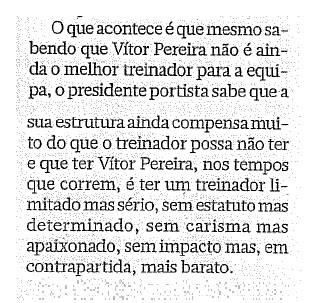 no dia em que a ASAE confirma o "dumping" na louca (e vergonhosa) promoção da cadeia de supermercados do "pingo hemofílico" - com «total desconhecimento» (!!!) do seu chairman -, e que a SAD do UD Leiria anuncia que «irá desistir» de permanecer na principal liga nacional de futebol (muito pouco) profissional - talvez porque o seu presidente demissionário emita letras sem qualquer cobertura... -, atente-se nas seguintes palavras do nosso estimado Rui Moreira, no seu mais recente artigo "bicampeões", publicado na sua coluna de opinião habitual PLENOS PODERES, no pasquim da Travessa da Queimada, na edição impressa de hoje: