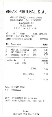 num destes dias, na área de serviço de Águas Santas, no sentido Valongo - Vila Real, por duas meias-de-leite e dois pães com manteiga, nada extravagantes e/ou excepcionais - portanto, muito parecidas com a imagem acima -, paguei a (nada) módica quantia de sete euros, i.e., aproximadamente mil quatrocentos e quatro escudos, como se confirma pelo recibo abaixo.