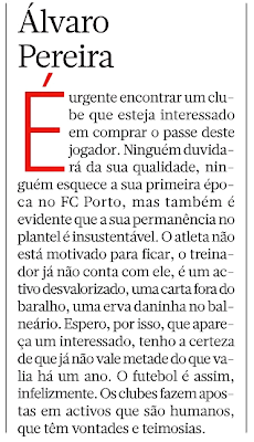 para lá de perceber que o Palito terá muito mais a perder com um (mais do que provável) ingresso num qualquer outro clube, de uma qualquer outra liga que não a lusa; que o FC Porto perderá um dos seus mais importantes activos, em quem "depositava" a confiança de que capitalizaria uma boa maquia num negócio futuro; que o actual treinador da equipa principal do clube perderá um elemento que seria uma mais-valia para o plantel (desde que estivesse em perfeitas condições físicas e psicológicas); que o empresário do jogador perdeu imensas oportunidades para estar caladinho e, de forma discreta, negociar com todas as partes interessadas uma futura transacção dos direitos desportivos do Palito - para lá de perceber tudo isto, faço votos para que os responsáveis do meu clube do coração retirem as devidas ilações de (mais) um exemplo de uma gestão desportiva de um jogador ruinosa para todas as partes envolvidas no seu processo. e que, se for possível, não o voltem a repetir. e que faço minhas as seguintes palavras de Rui Moreira, publicadas a 10 de agosto, no pasquim da Travessa da Queimada, no seu escrito "os jogos":