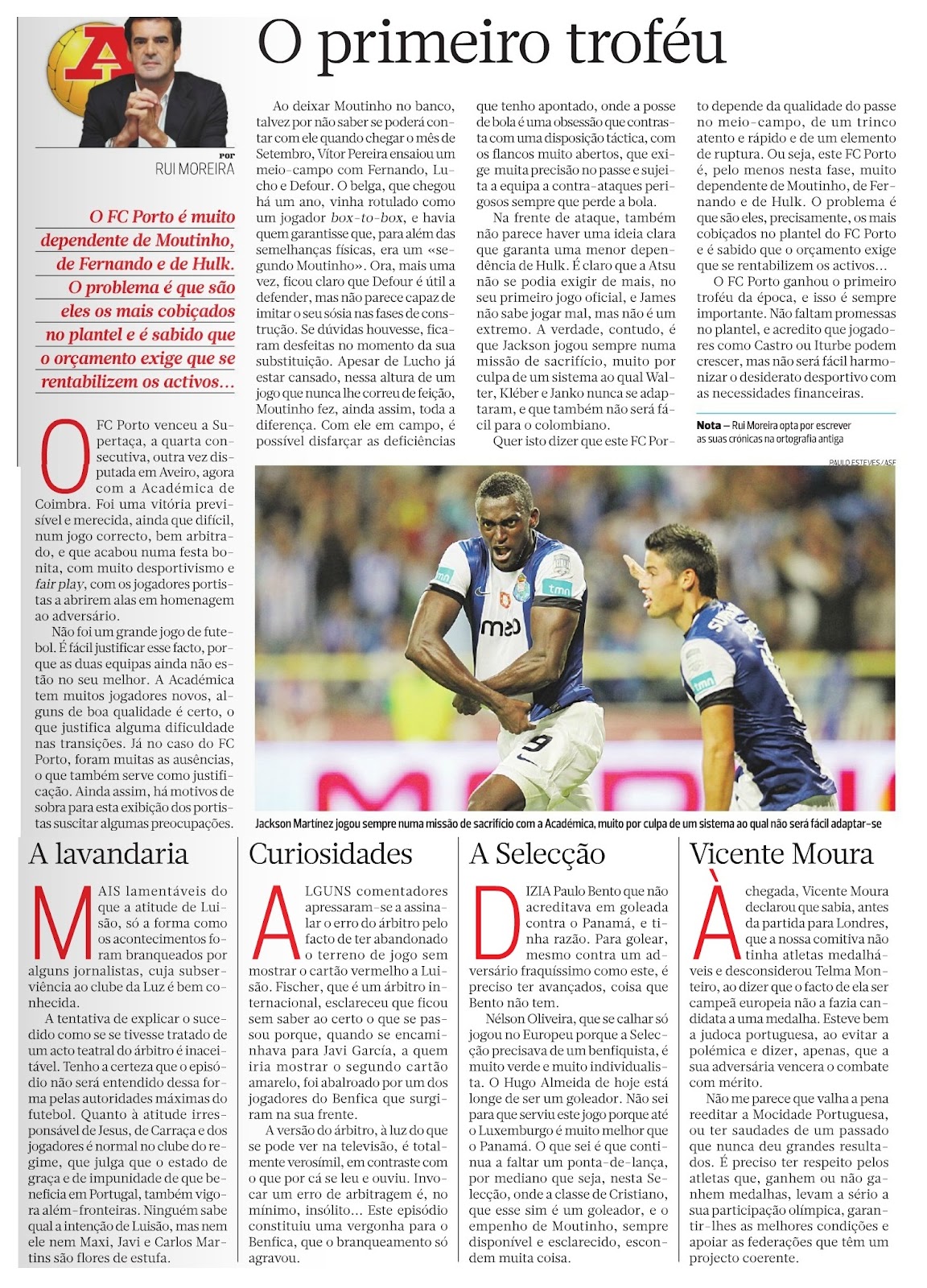 também o nosso caríssimo Rui Moreira, faz alarde de toda esta abjecta hipocrisia, em "o primeiro troféu" - o mais recente artigo publicado na sua coluna de opinião PLENOS PODERES, habitual às Sextas-feiras no pasquim da Travessa da Queimada -, no destaque a que epitetou de "a lavandaria":