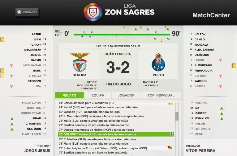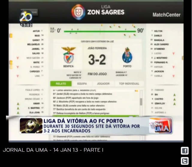 prosseguiu com as declarações do nosso grande presidente, que até demonstrou que o desejo da Liga Portuguesa de Futebol (muito pouco) Profissional era outro, num erro demasiado grosseiro para ser desculpado. aliás, e sobre este lamentável episódio, parece que a TVI também não sabe quem venceu o Clássico, como a imagem a seguir o comprova para a "posteridade":