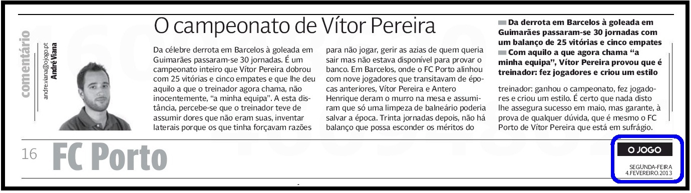 estiver interessado e da edição impressa de ontem, Domingo (2013-02-03), do pasquim da Travessa da Queimada, divulgo à saciedade:(i) o dossier dedicado ao FC Porto e à sua vitória em Guimarães - o qual não inclui a vitória no hóquei ante o zbording nem o rescaldo da vitória da equipa B ante os caceteiros da Oliveirense;