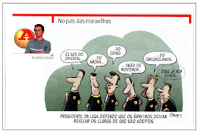 para lá da capa acima, onde se (pres)sentem as lágrimas de crocodilo imensamente carpidas na Travessa da Queimada - mormente no editorial "o castigo do 'já chega'" (da autoria do belenense vítor serpa), nos artigos de opinião "que raio, FC Porto!" (do (in)suspeito santos neves), e "sobre presidentes, treinadores e filósofos" (com a chancela de "qualidade" lampiónica dO leonor pinhão), e no dossier dedicado ao FC Porto, talvez recomende a visualização atenta (e para desanuviar...) do cartoon que se segue, a propósito das últimas declarações do actual presidente da Liga Portuguesa de Futebol (muito pouco) Profissional: