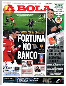 para lá da capa acima, onde lanço o desafio de conseguires encontrar a referência ao nosso clube do coração; dos artigos de opinião "falta de Mundo" (do nosso caríssimo Rui Moreira, na sua rubrica habitual "PLENOS PODERES"), e do "o preconceito e o prejuízo" (de Paulo Teixeira Pinto); das soberbas declarações do «Mestre da Europa»; do consequente editorial "consequências de Málaga e de Bordéus" (da autoria do excremento (do) Delgado); do dossier dedicado ao FC Porto (que "vale" pelo seu todo, mas no qual não constam (i) uma análise às declarações de James e (ii) o devido rescaldo à partida no La Rosaleda); da "explosão" de Uli Hoeness, mesmo tendo o FC Bayern München passado aos quartos na Champions; das mais recentes declarações do d10s argentino, Maradona (a propósito da eleição de Francisco I, o mais recente Papa argentino), talvez recomende a visualização atenta do cartoon que se segue, por ser ilustrativa dessa lampiónica bazófia arrogante (porque perene de uma «gloriosa» Soberba) que já se (pres)sente, não só lá para os lados de Carnide, mas também para a Travessa da Queimada: