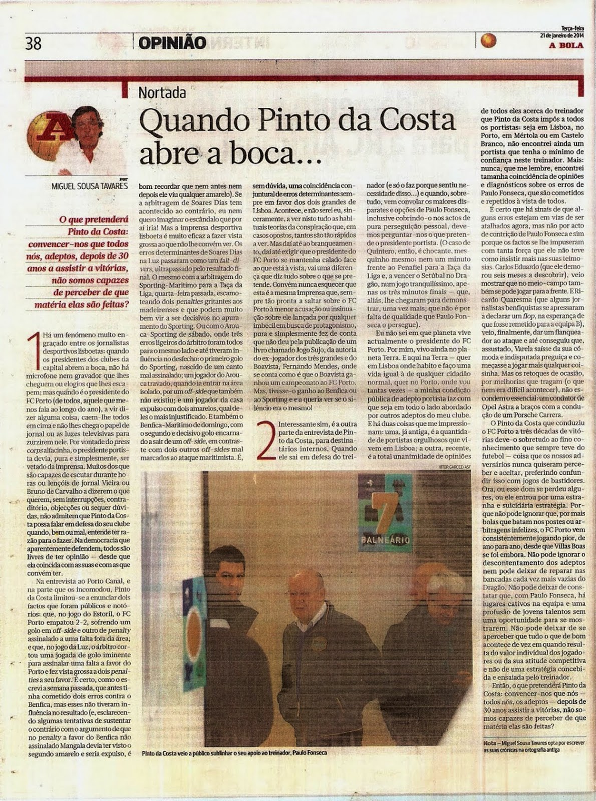 o nosso enfant terrible, Miguel Sousa Tavares, na sua NORTADA de hoje ("sacada", com o devido crédito a quem a difundiu à saciedade: o caríssimo dragão Vila Pouca, no extremamente azul "dragão até à morte"), sob o título "quando Pinto da Costa abre a boca..." critica os críticos que criticaram as críticas veementes do nosso grande presidente, na entrevista que concedeu na passada Quinta-feira.