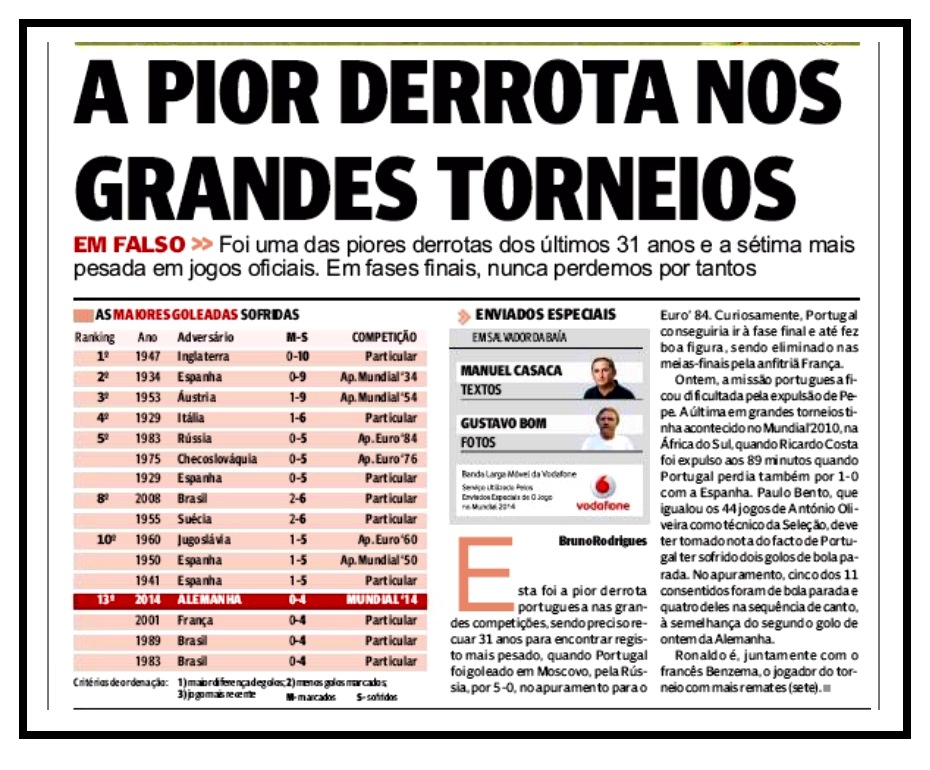 não!, não me refiro ao atropelo alemão de ontem, em Salvador da Bahia, sequer às hipotéticas (por que patéticas) justificações para uma copiosa derrota que muito deveria envergonhar quem teve a (ir)responsabilidade de escolher os seus protegidos, mais pela bajulice e adulação do que pelo mérito desportivo.
