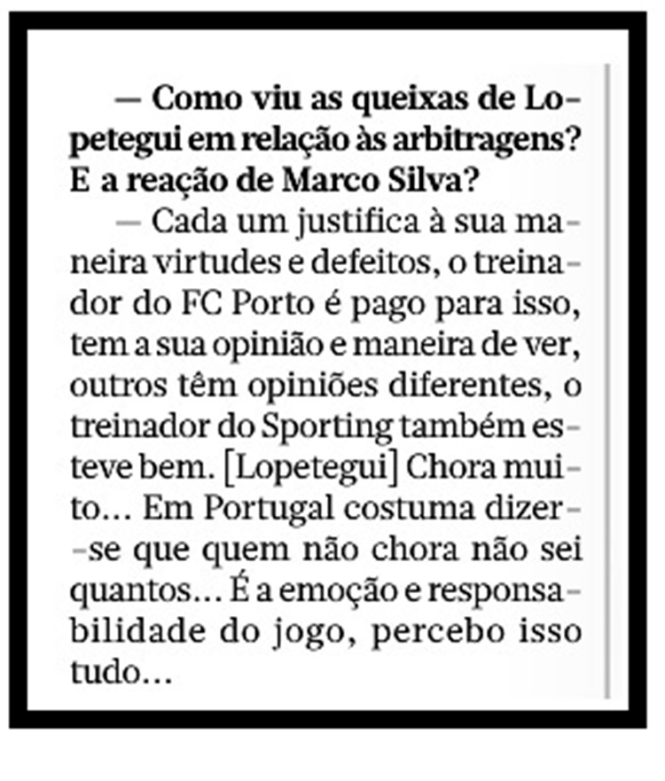 « por que razão quando uns são prejudicados, ele [Vítor Pereira] se sente na obrigação de vir dar explicações públicas, mas já não faz o mesmo quando, como foi o caso, o prejudicado é o FC Porto?»