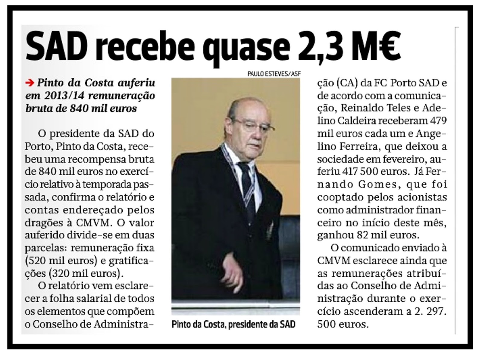 no entanto e sem (in)tentar pretender "assobiar para o lado" perante esta realidade factual, proponho-te o exercício de encontrares igual referência à descriminação de igual tipologia de valores em relação à SAD do 5lb... é que (alguns de) nós e a opinião pública em geral, estamos indignados tão-somente porque a SAD portista os divulgou;os outros e como se pode ler aqui, não se sentem à vontade (?) para o fazer porque (e cito) «a SAD não divulga os parâmetros para as remunerações e prémios do exercício fiscal»...