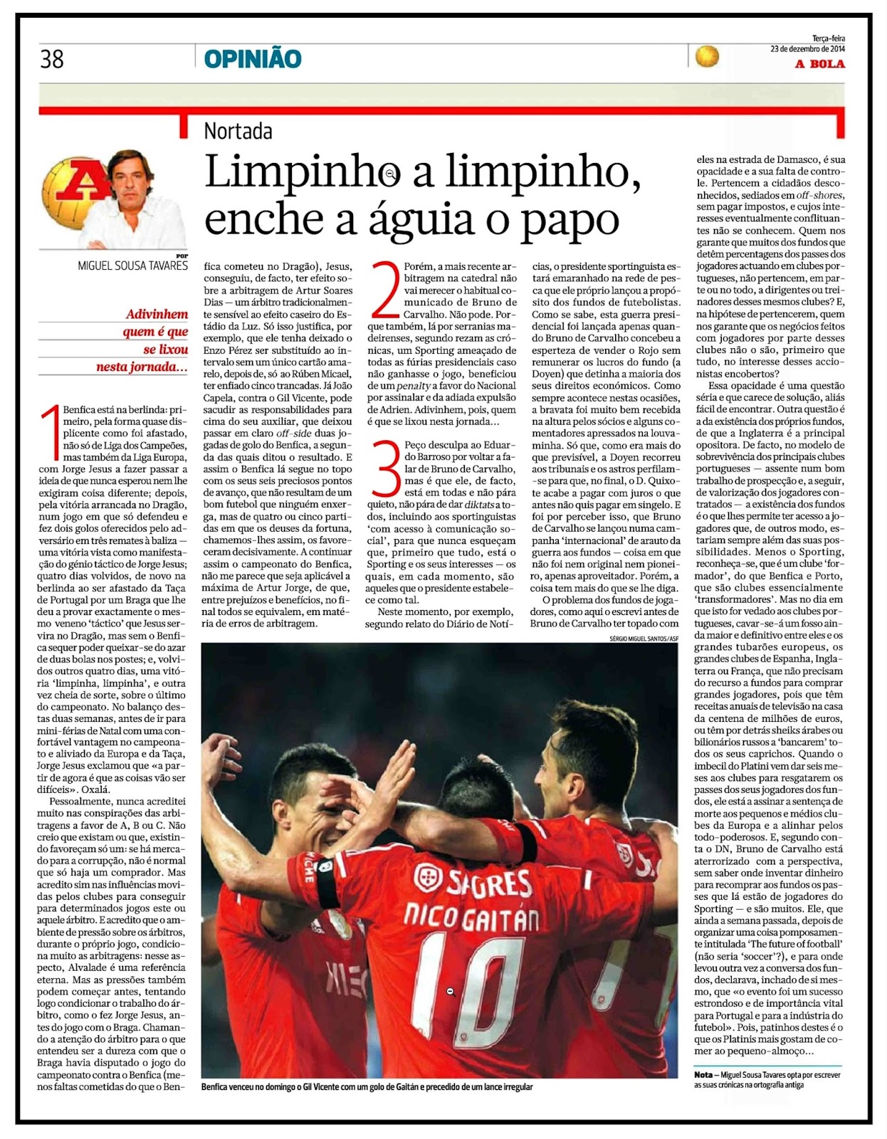 aliás e no seu estilo muito próprio, o nosso enfant terrible, Miguel Sousa Tavares, na última NORTADA, sob o título "limpinho a limpinho, enche a águia o papo" (aqui), também o refere. mas ele joga num outro "campeonato" que os comuns bloggers não têm acesso e ao qual estão vedadas quaisquer veleidades...