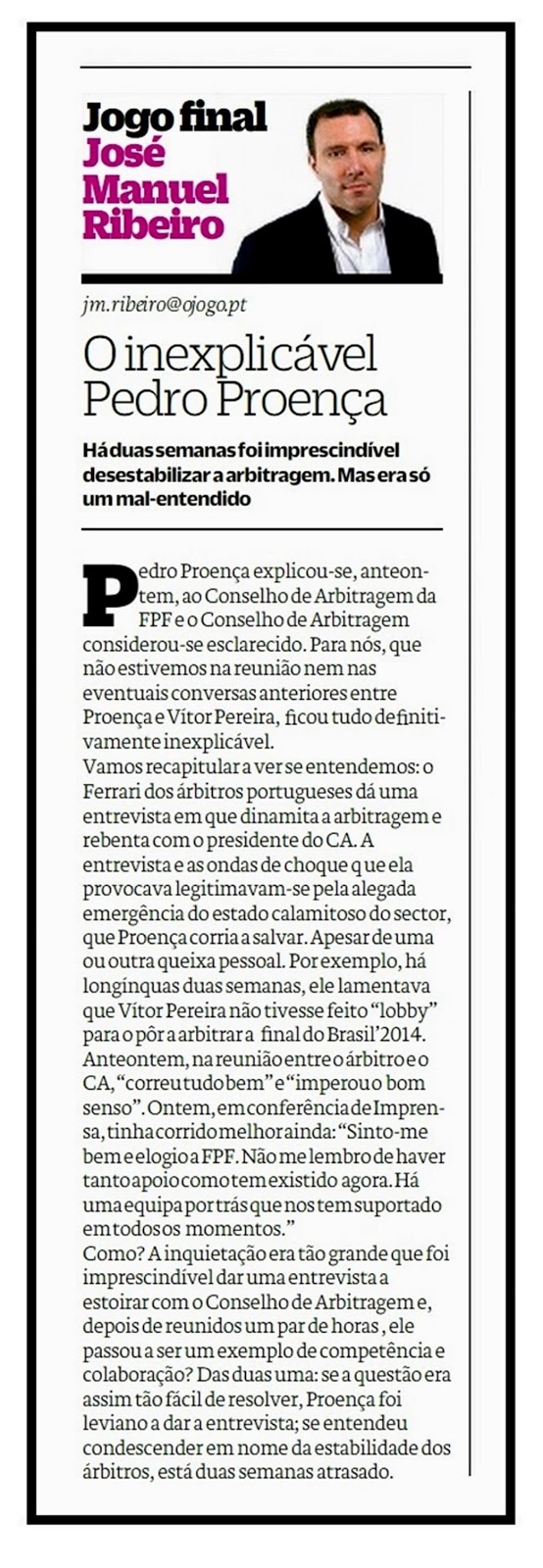 » o editorial de José Manuel Ribeiro "o inexplicável Pedro Proença" (aqui), publicado no pasquim do 'Quim Oliveirinha de ontem, e com o qual concordo em absoluto;