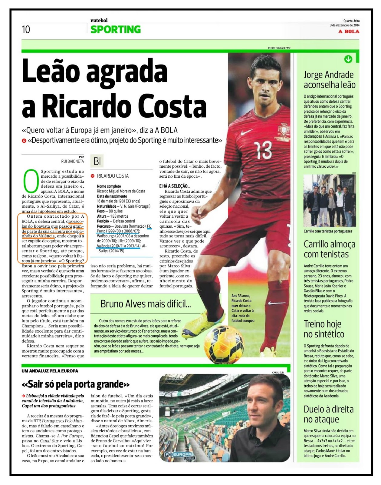 um tal de Baioneta, hoje, no pasquim do regime, teve um lapso de memória a propósito da possível contratação de Ricardo Costa por parte dos viscondes falidos.