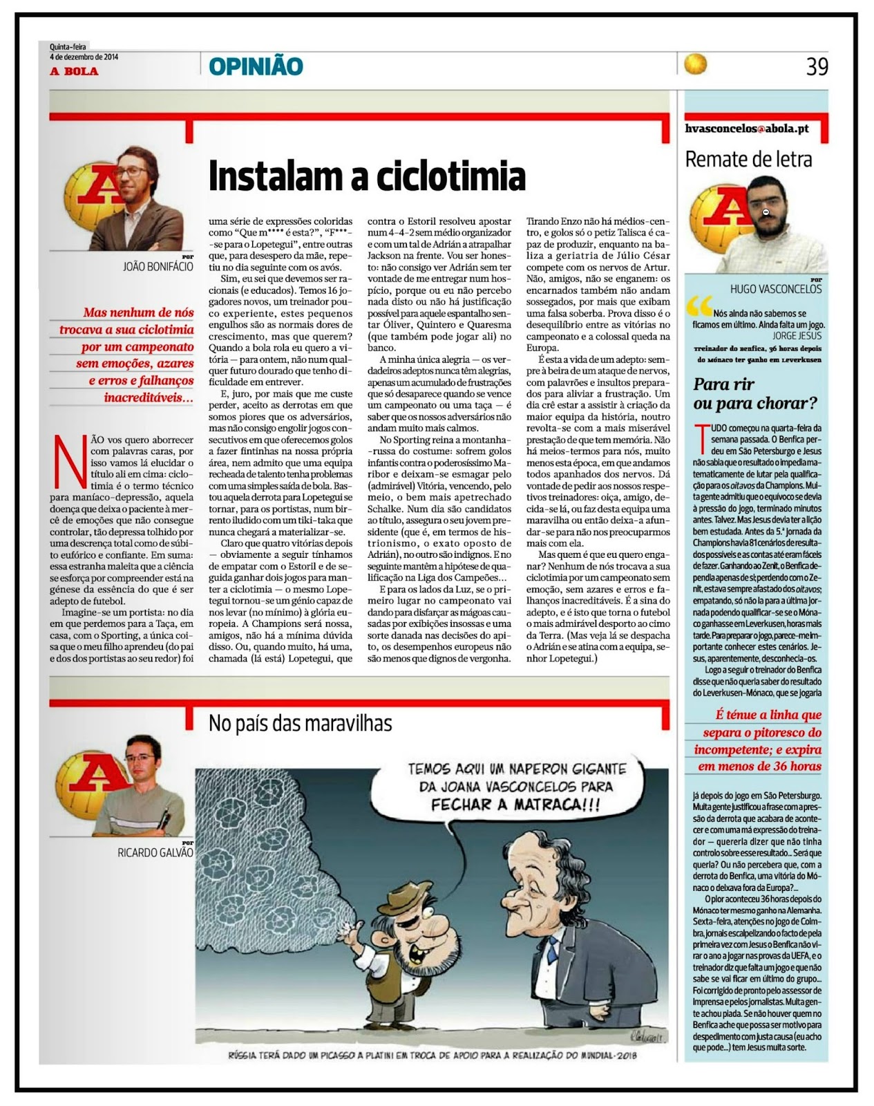 » o artigo de opinião de João Bonifácio "instalar a ciclotimia" (aqui), o qual tem apenso o "bónus" da última dissertação do huguinho vasconcelos (aqui) - «ambos os dois» publicados na edição impressa de hoje, do pasquim da Travessa da Queimada;