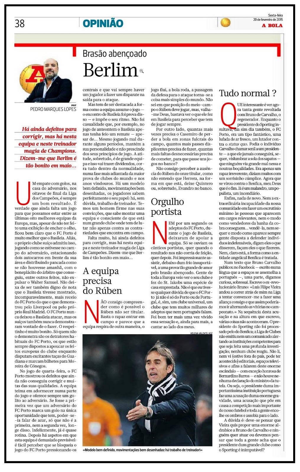 não afirmo que terá sido um hino ao desporto-rei, mas foi um desafio agradável de se assistir, com muita objectividade no jogo, uma esmagadora posse de bola para quem se apresentou como visitante, procura incessante do golo, solidez defensiva (pese embora aquela desatenção que possibilitou o golo do Basileia no único remate que se fez à baliza de Fabiano), acerto nos passes, variações de flanco assertivas e sobretudo muita personalidade.