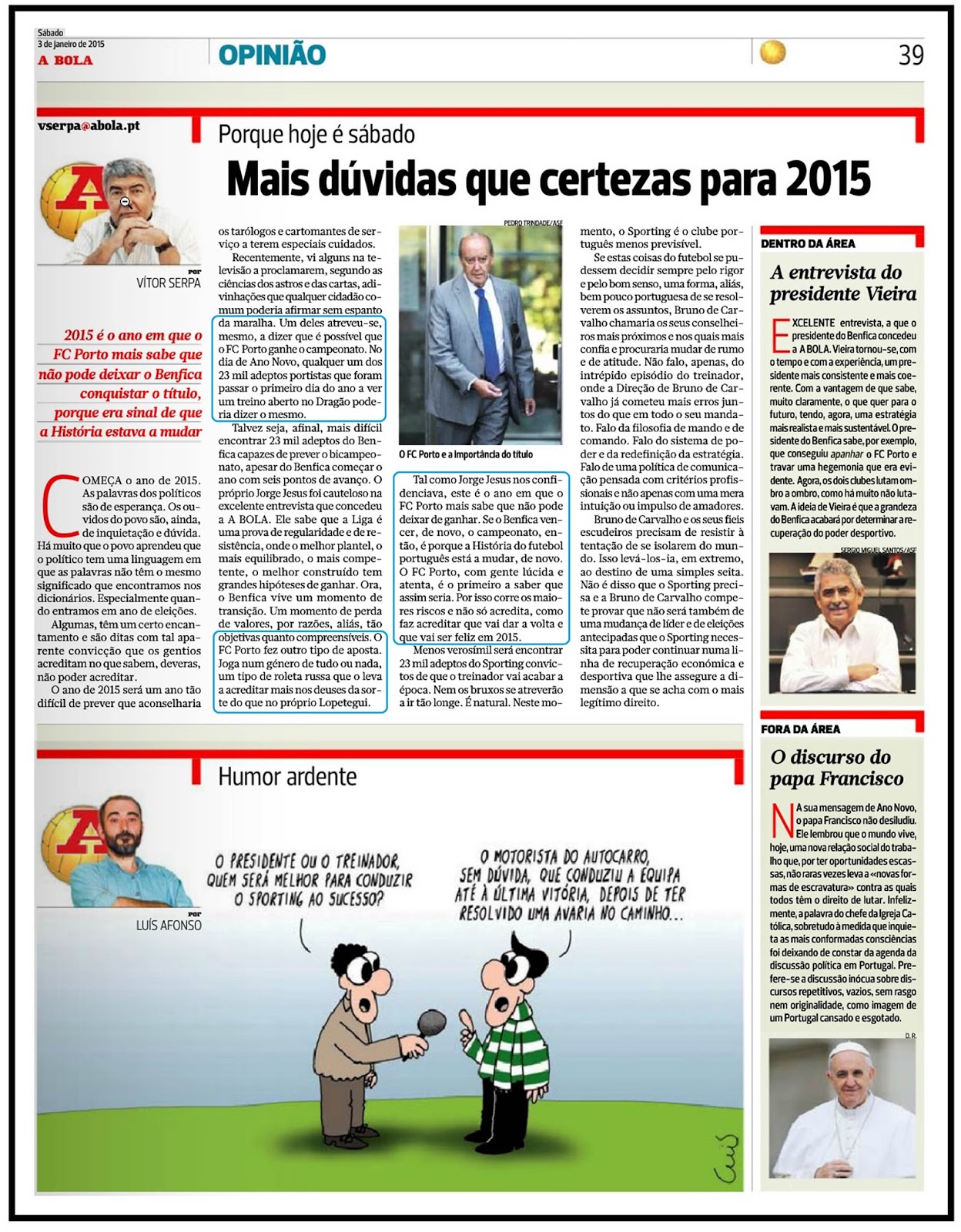 pelo teor do seu abjecto artigo de opinião "mais dúvidas do que certezas para 2015" (aqui), desejo que o "belenense" vítor serpa tenha um excelente 2015, presumivelmente pintado a azul-e-branco. e que, no final, lá para Maio, todas as suas dúvidas sejam as nossas certezas mais convictas.